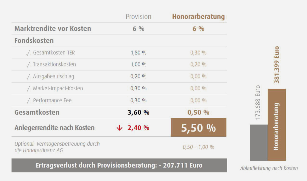 Im Vergleich zu einer Honorarberatung verlieren Sie durch die vermeintlich kostenfreie Beratung des Provisionsvermittlers 207.711 Euro durch hohe Produktkosten.